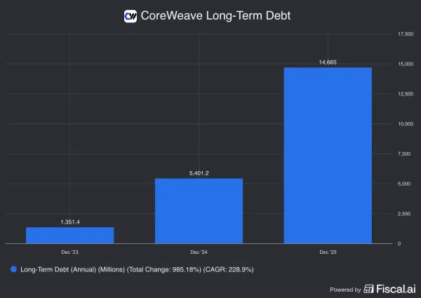 For 2026, CoreWeave has forecasted capital expenditure of $30 billion to $35 billion in 2026, compared to $14.9 billion spent in 2025. The company also reported long-term debt of $14.67 billion as of Dec. 31, 2025, compared to $5.4 billion as of Dec. 31, 2024.