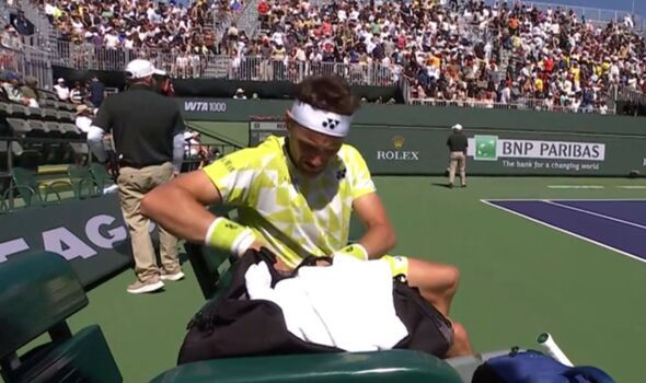 The players sat on the sidelines while a court attendant brought a bag of ice and a bottle of water to the stands. As the delay continued, Ruud paced around at the side of the court, and Shevchenko took the opportunity to walk towards his coaching box for a quick chat.